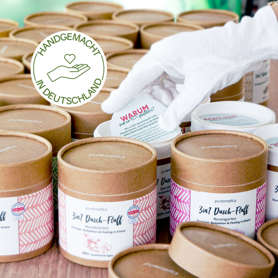 Diese haben wir eigens in Kooperation mit einem regionalen Produzenten für unsere 3in1 Dusch-Fluffs entwickelt. Sie werden in Deutschland produziert und kommen dabei ganz ohne Plastik oder Bioplastikbeschichtung aus und halten deinen Dusch-Fluff dennoch frisch.