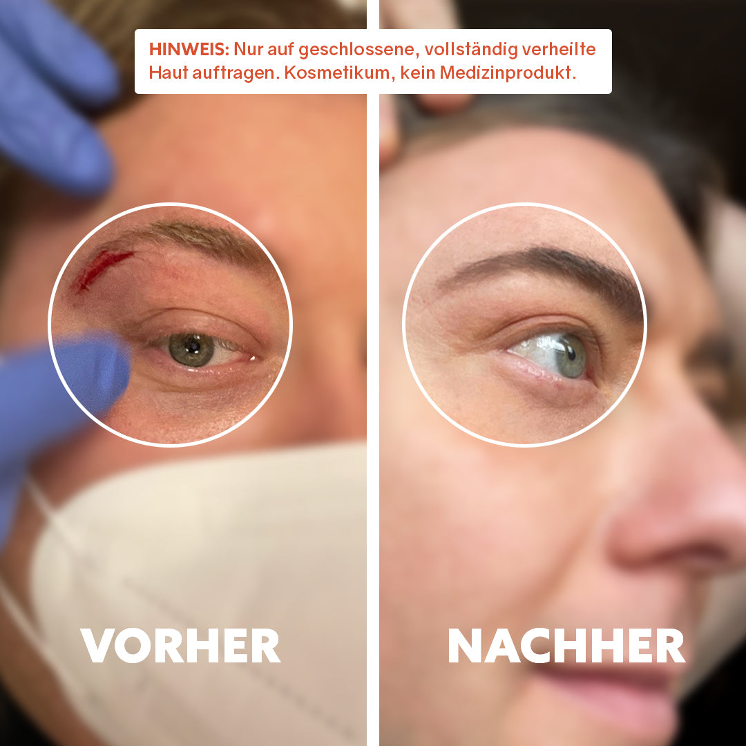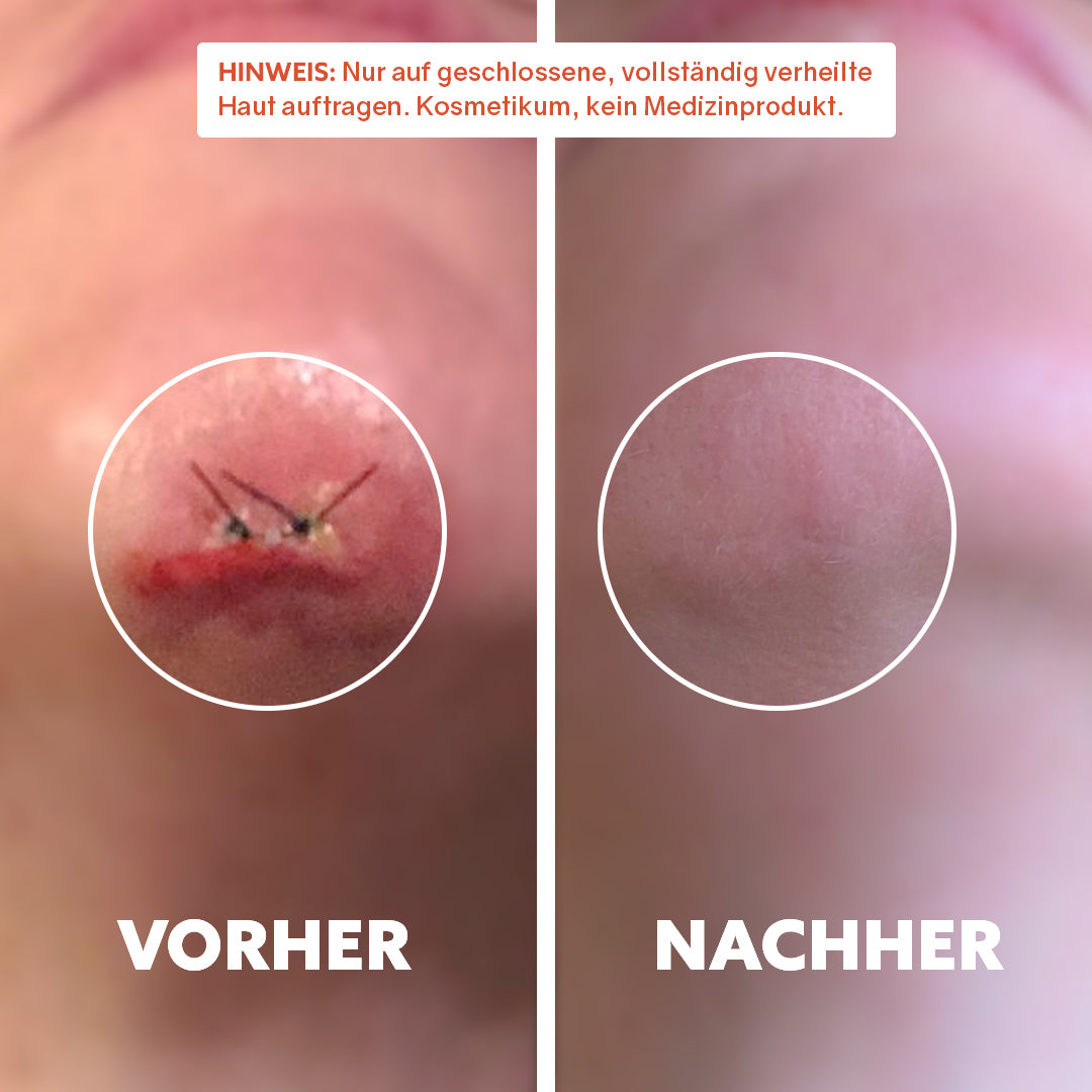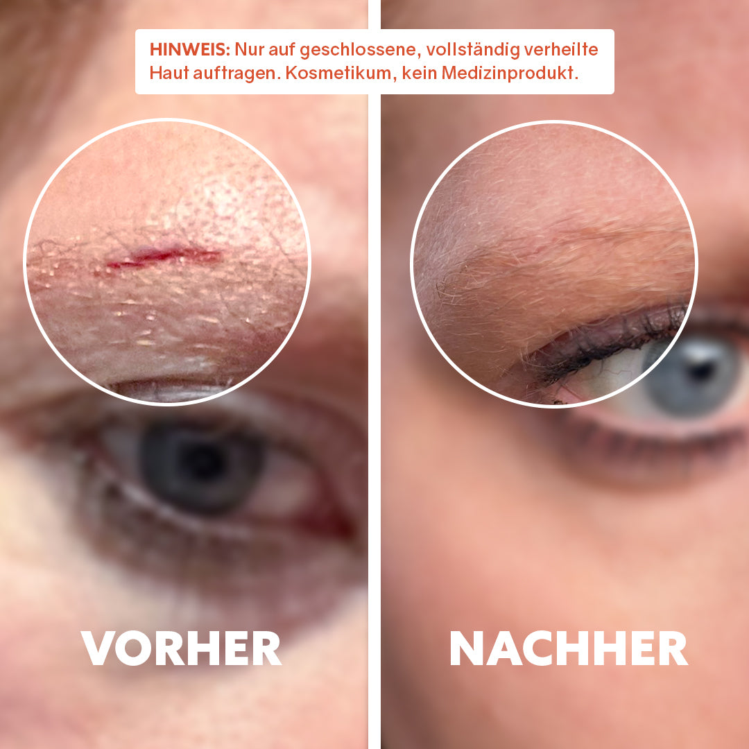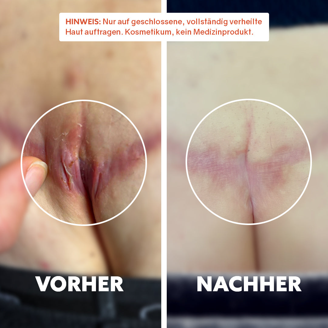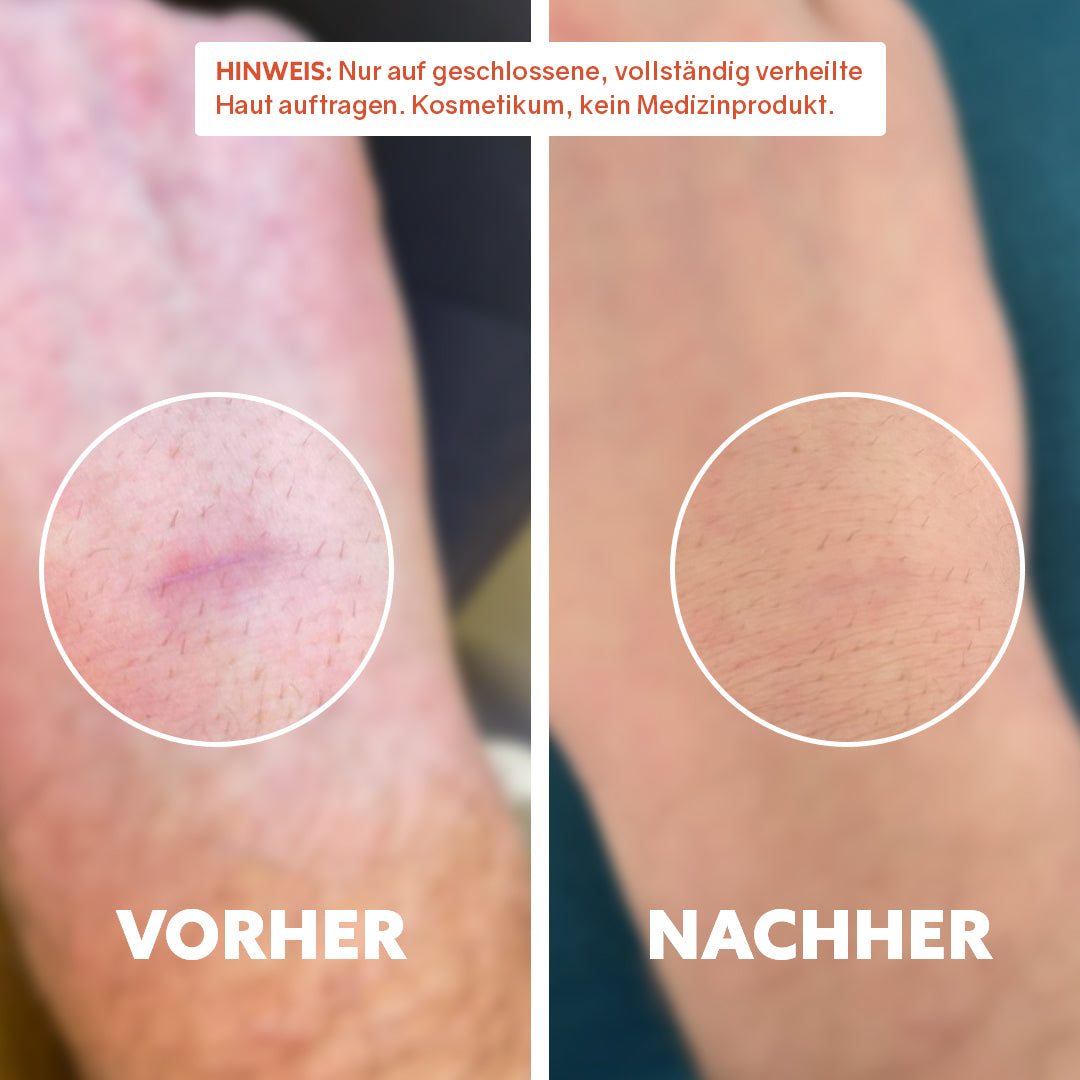 Mit fortlaufender Anwendung kann die Haut gleichmäßiger erscheinen. Trockenheitsbedingte Unebenheiten oder raue Bereiche wirken oft sichtbar glatter, und die Narbe fügt sich optisch harmonischer ins umgebende Hautbild ein.